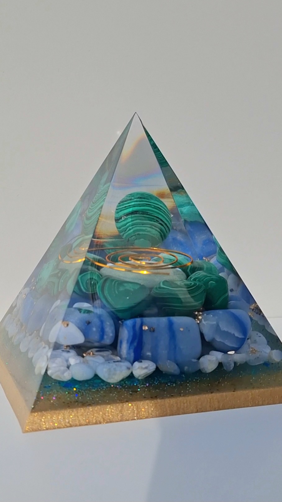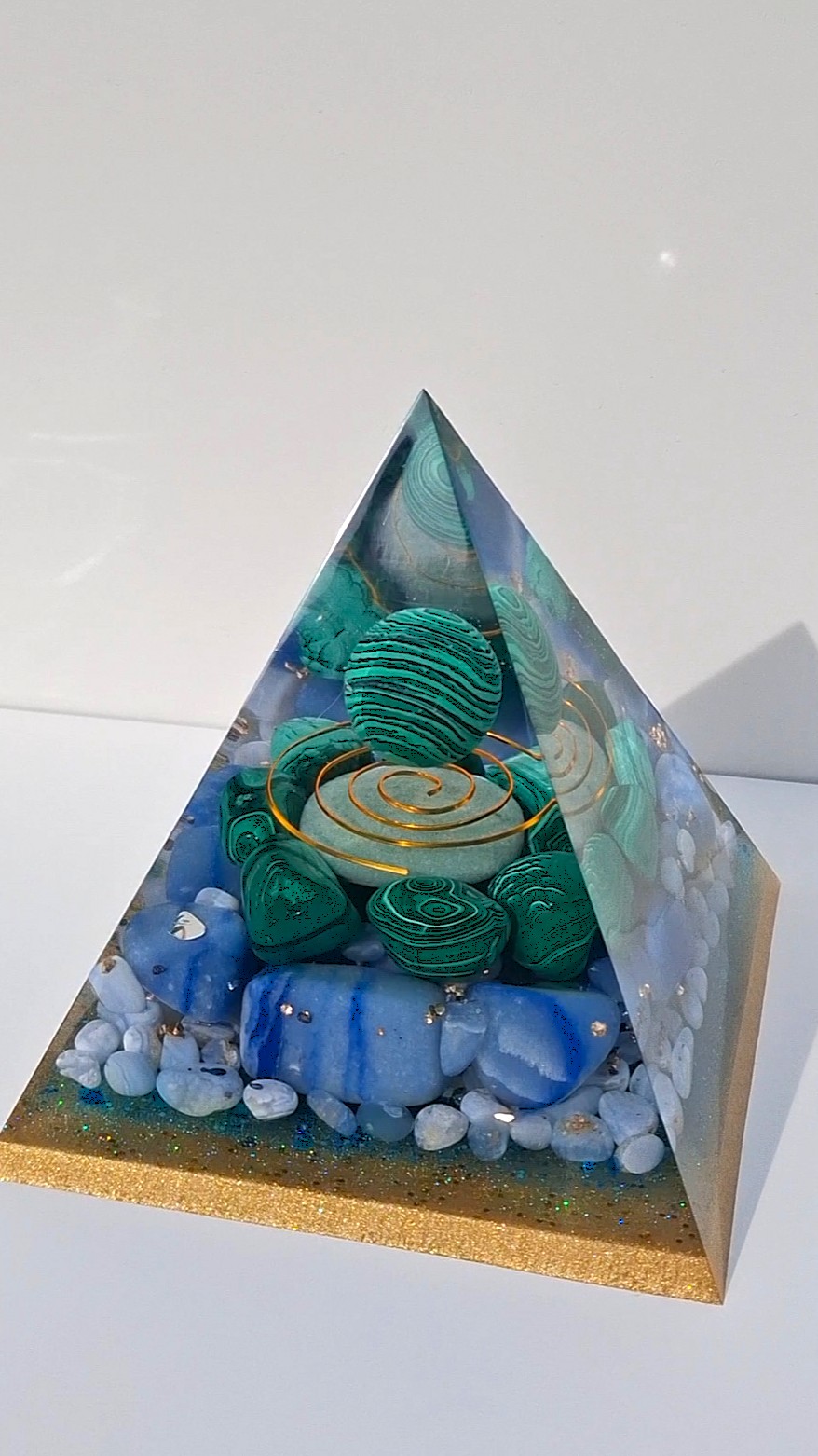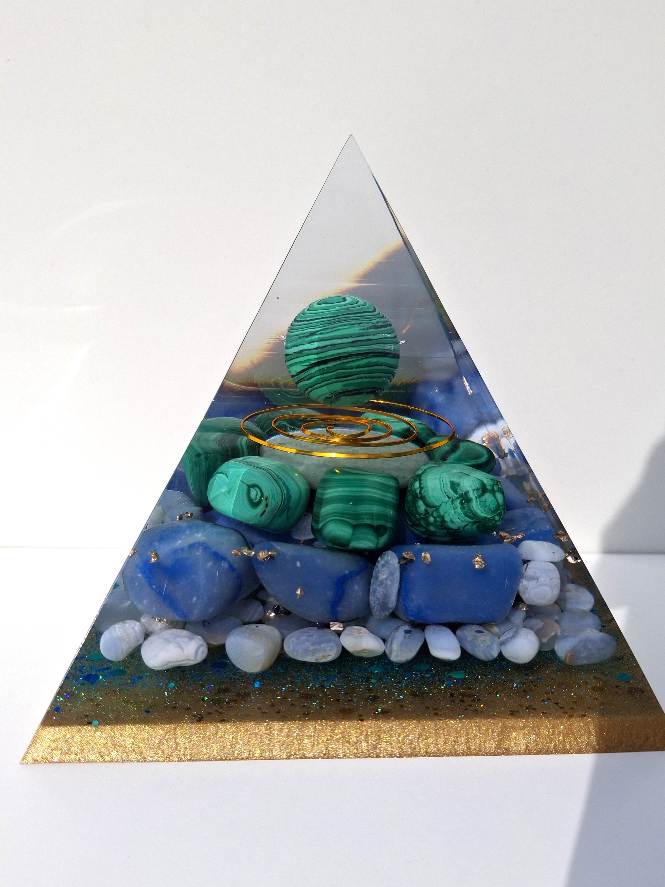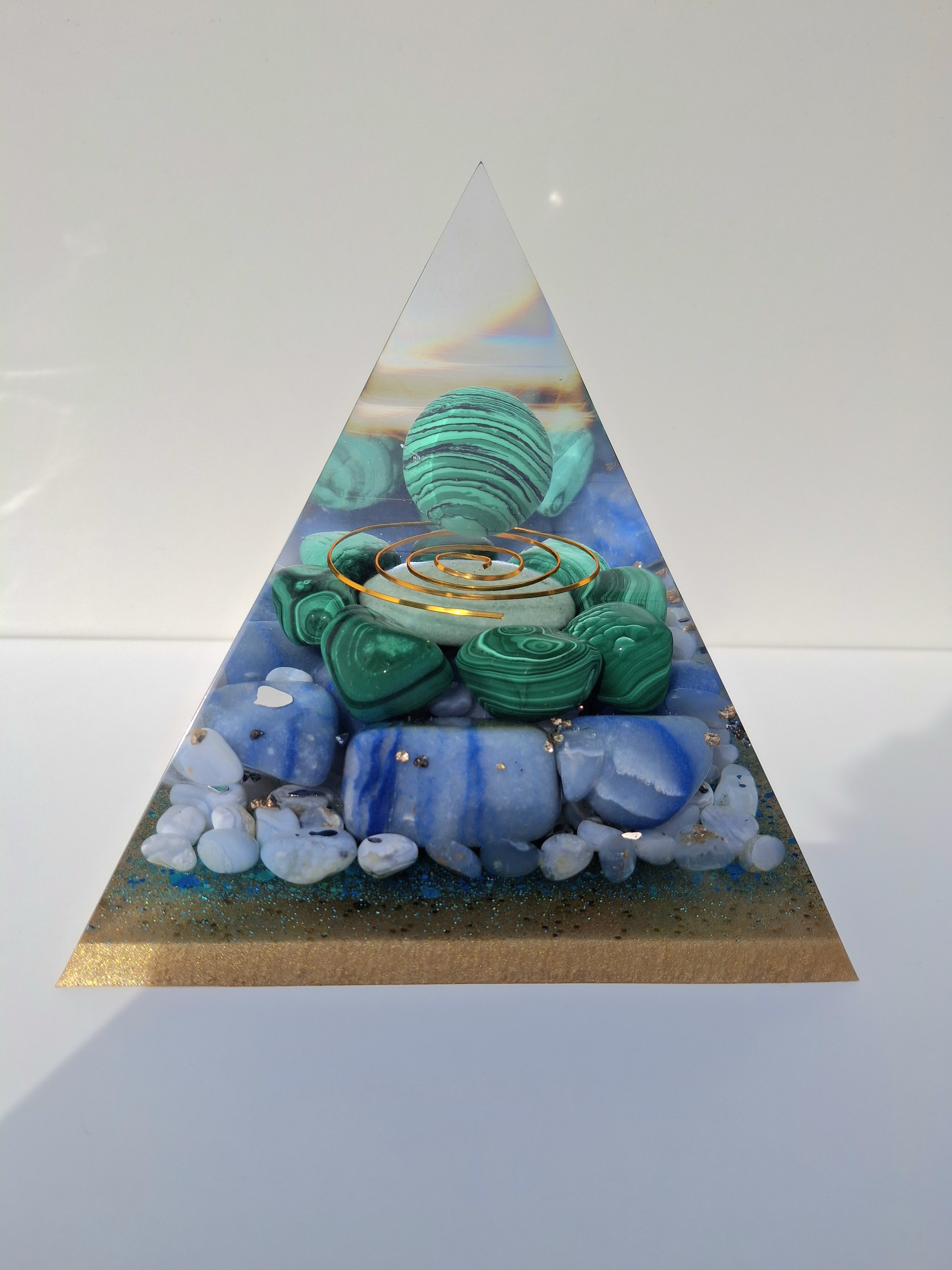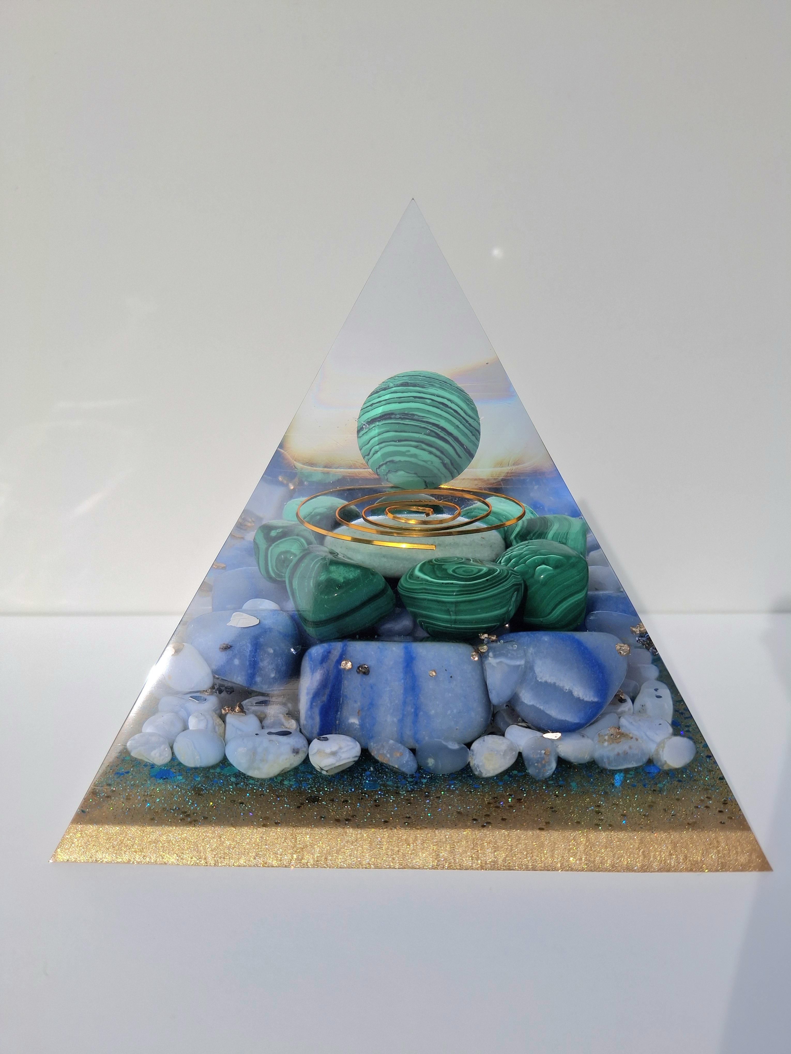 Ručne vyrobená živicová pyramída, nabitá silou prírody a minerálov, ktoré podporujú rovnováhu, uzemnenie a vnútorný pokoj. V srdci pyramídy sa nachádza malachit – kameň transformácie a ochrany, obklopený upokojujúcim modrým chalcedónom, harmonizujúcim avanturínom a modrým kameňom pre vnútornú jasnosť.