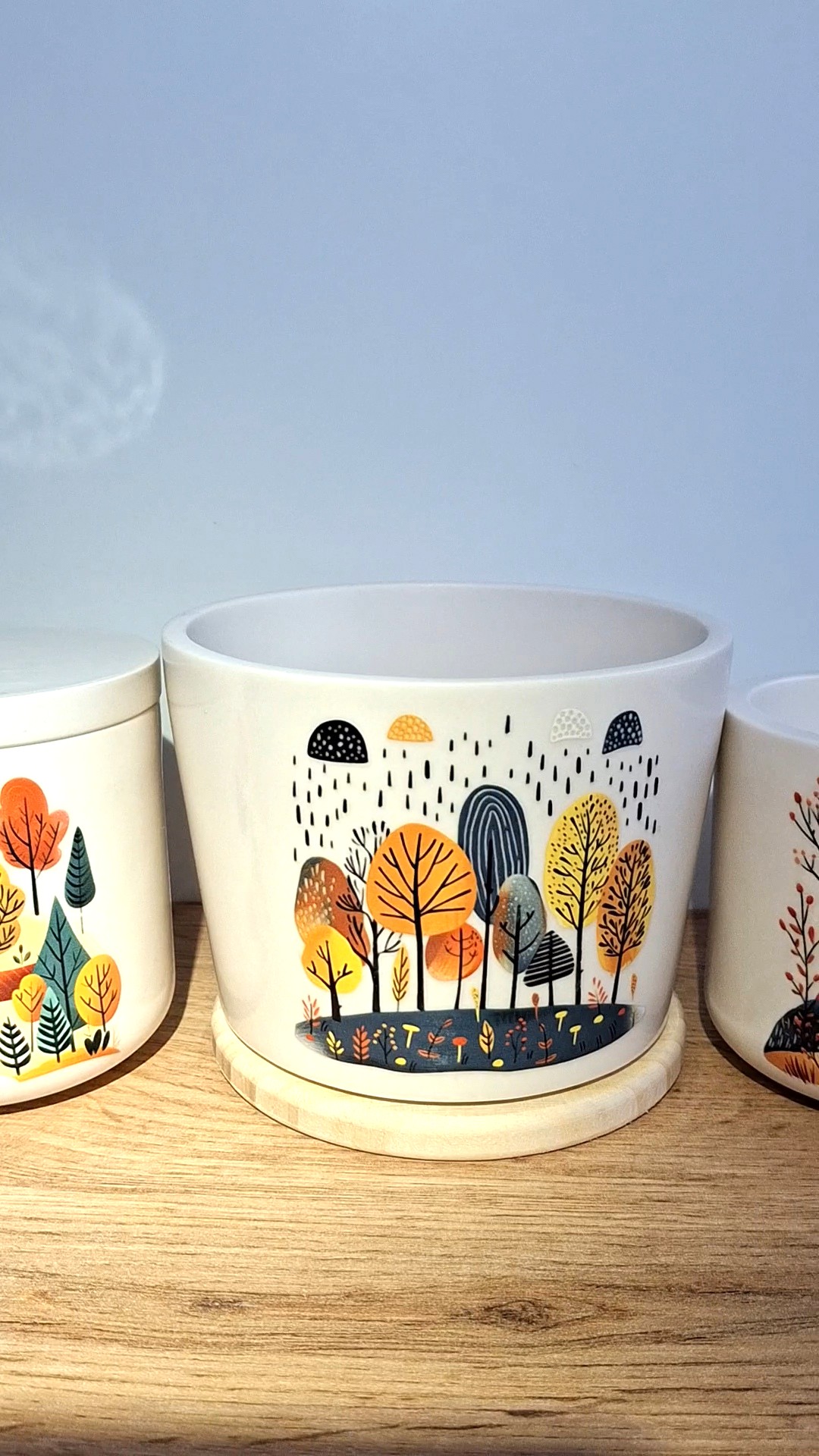 Ručne odlievaný kvetináč v zemitých tónoch, doplnený o drevený podstavec.