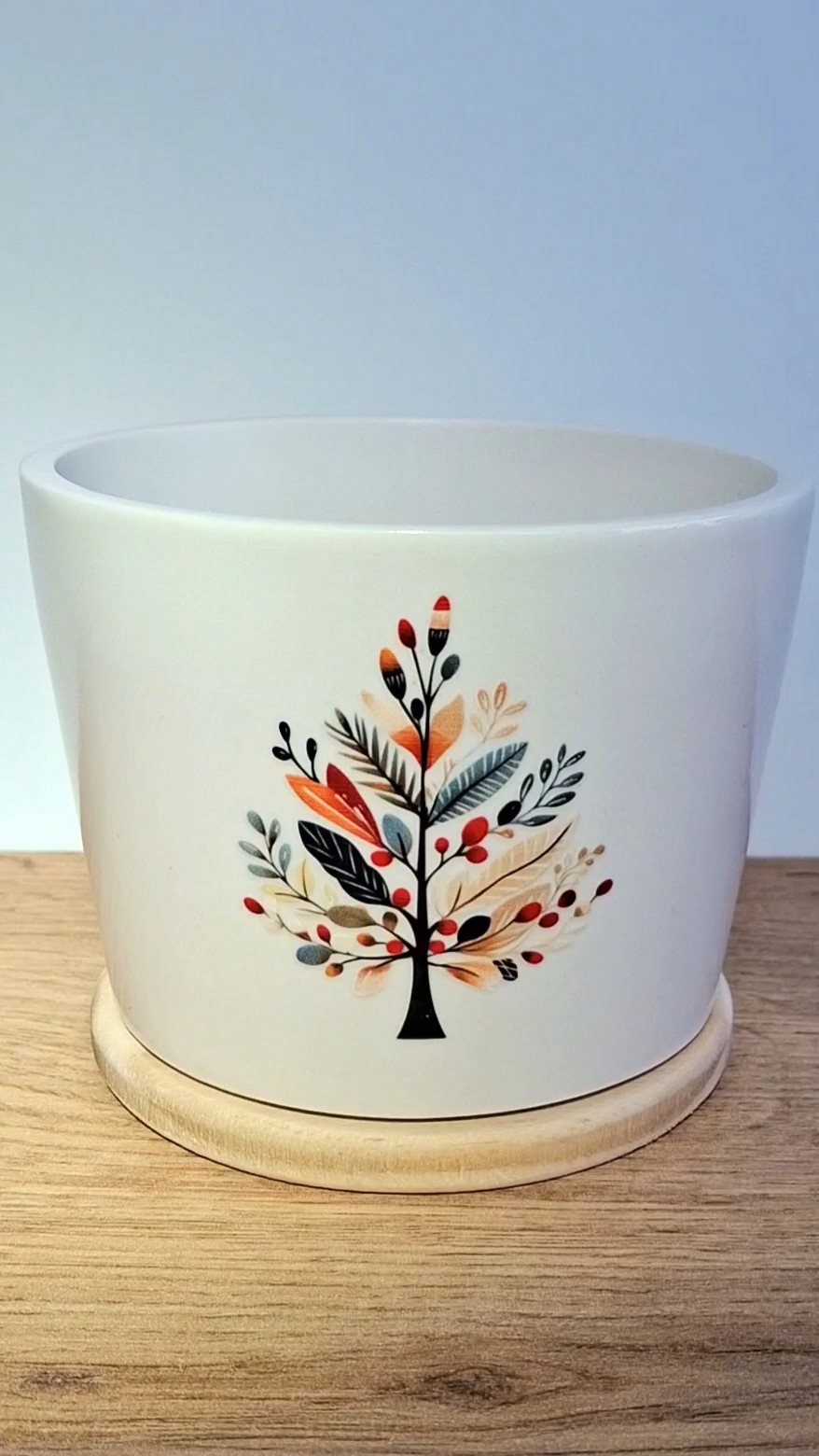 Ručne odlievaný kvetináč v zemitých tónoch, doplnený o drevený podstavec.